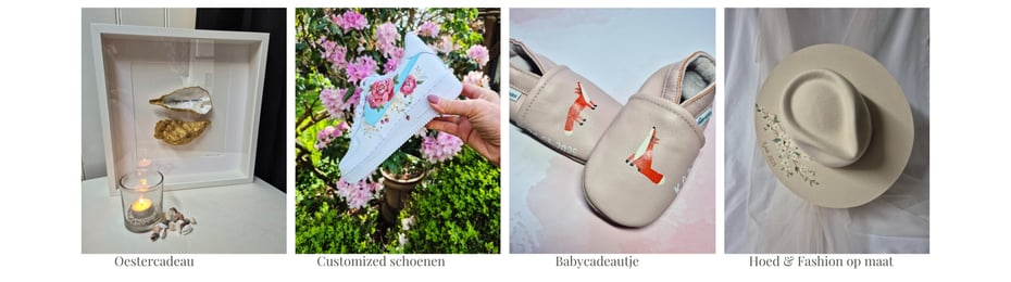 Denk aan prachtig beschilderde fashion, te gekke schoenen, handbeschilderde vazen, gepersonaliseerde champagneflessen, babyslofjes of stoere jasjes met een artistieke twist. Elk item is uniek, stijlvol en met de hand beschilderd of bedrukt, geen massaproductie, maar met karakter. Voor wie niet van standaard houdt, maar van een persoonlijk statement met een vleugje lef.