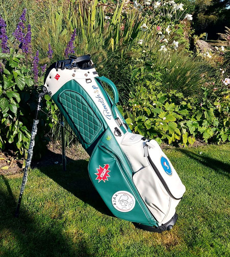 Voor een 60-jarige mocht ik een Titleist golftas voorzien van allerlei plaatjes alsof een levensverhaal in beeld kwam.